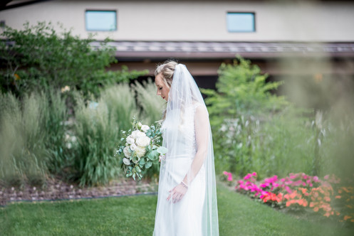 Their big day FINALLY arrived (and I loved hearing the excitement in Melanie's voice as we got closer and closer). I arrived at Sentryworld in Stevens Point, and met up with the ladies in the bridal salon. Melanie had her dress all set up for pictures, and it was stunning! Her bouquet of flowers (done by Blooming Envy) was also stunning!